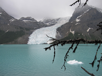 Vi vågnede midt om natten ved lyden af torden - troede vi. Det viste sig, at man, specielt om natten, kunne høre gletsjeren kælve, og ganske rigtigt - næste dag var Berg Lake fyldt af store isklumper, som var brækket af om natten.