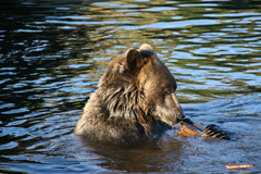 havvand strømmer hen over ens opvarmede krop. Dagen efter kørte vi en tur til Ucluelet syd for Tofino, hvor der efter sigende er et godt sted at se bjørnene fiske laks.